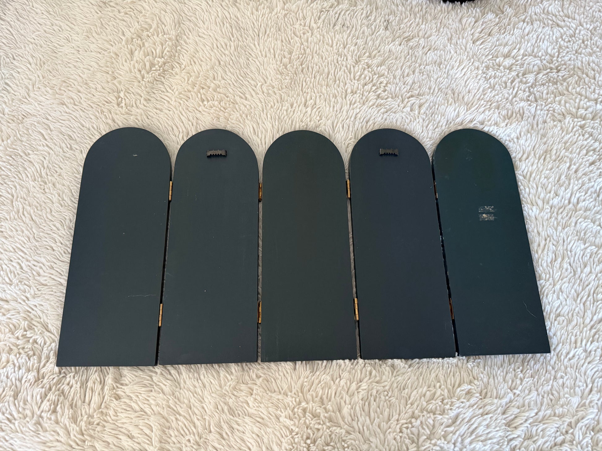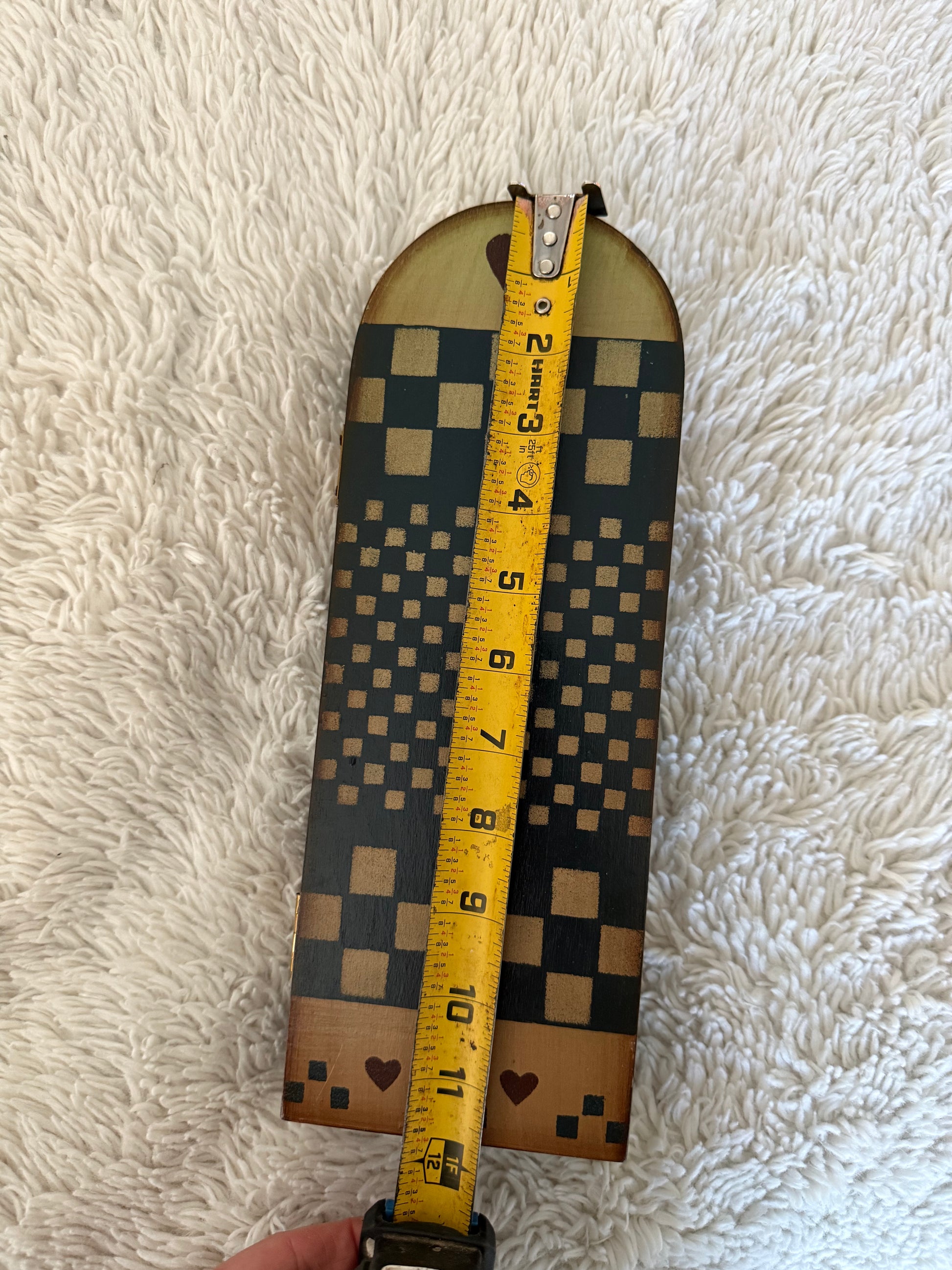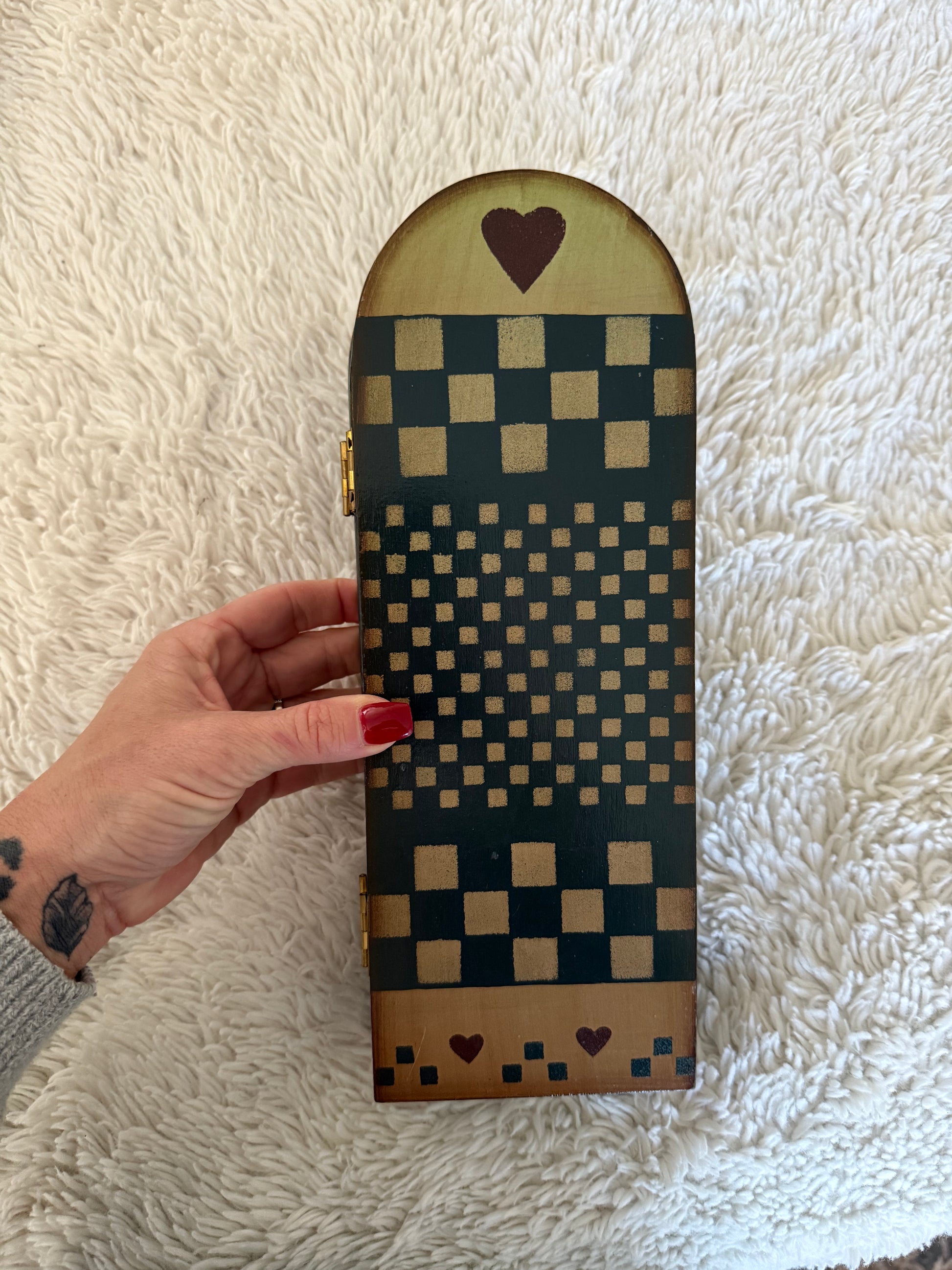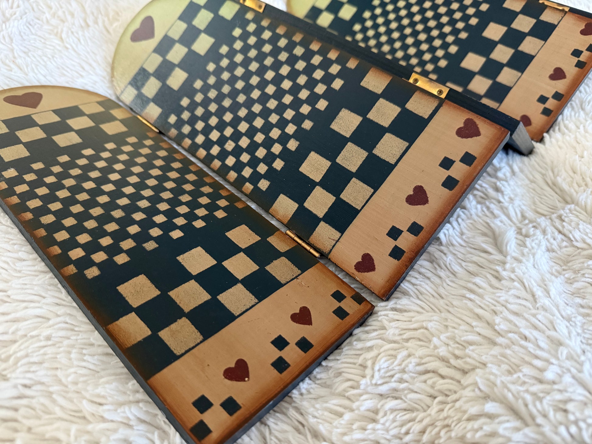 Charming folding wooden screen featuring a hand-painted checker pattern with heart details in warm tan, black, and muted green tones. The arched panels and folk art design give this piece a cozy, country feel that works beautifully on a shelf, mantel, or tabletop display. This is a vintage-style decorative accent with classic farmhouse character.