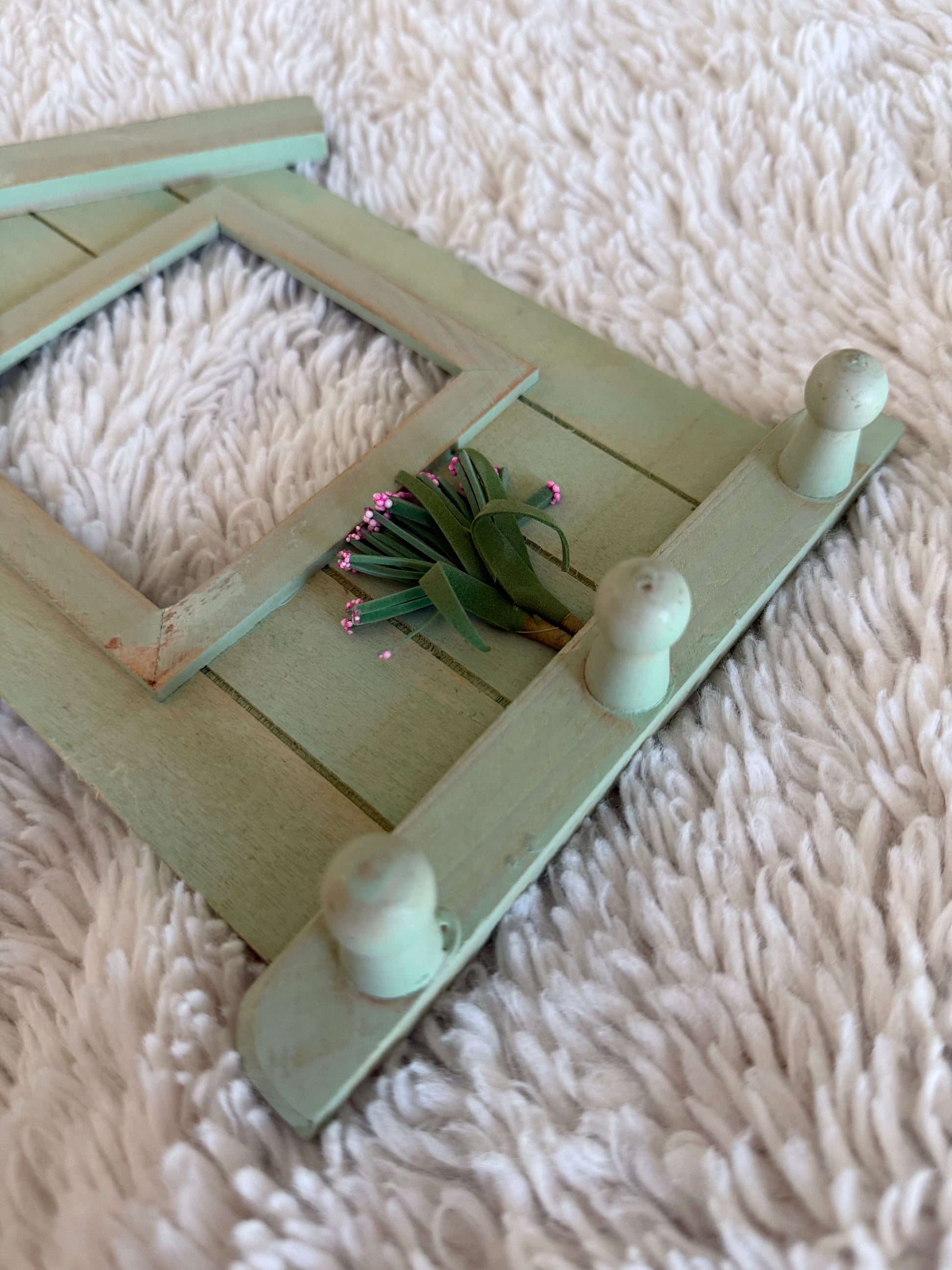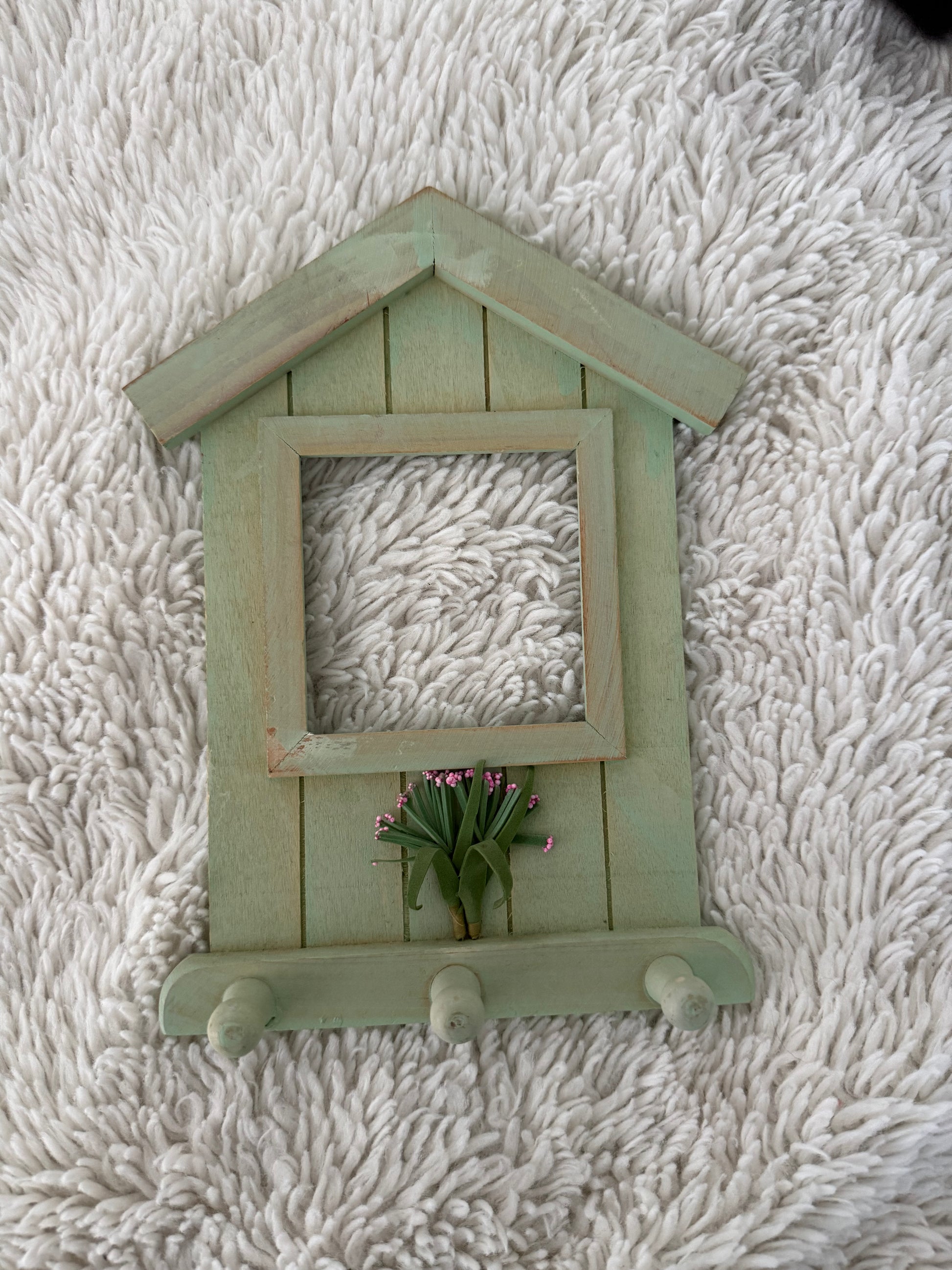 Charming house-shaped wall piece in a soft sage green with a small faux floral detail and three peg pegs along the bottom. Designed as a picture frame with an open window for displaying a small photo or print. This is a sweet vintage-style décor piece with cozy cottage charm.