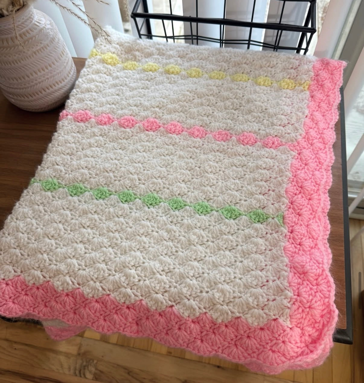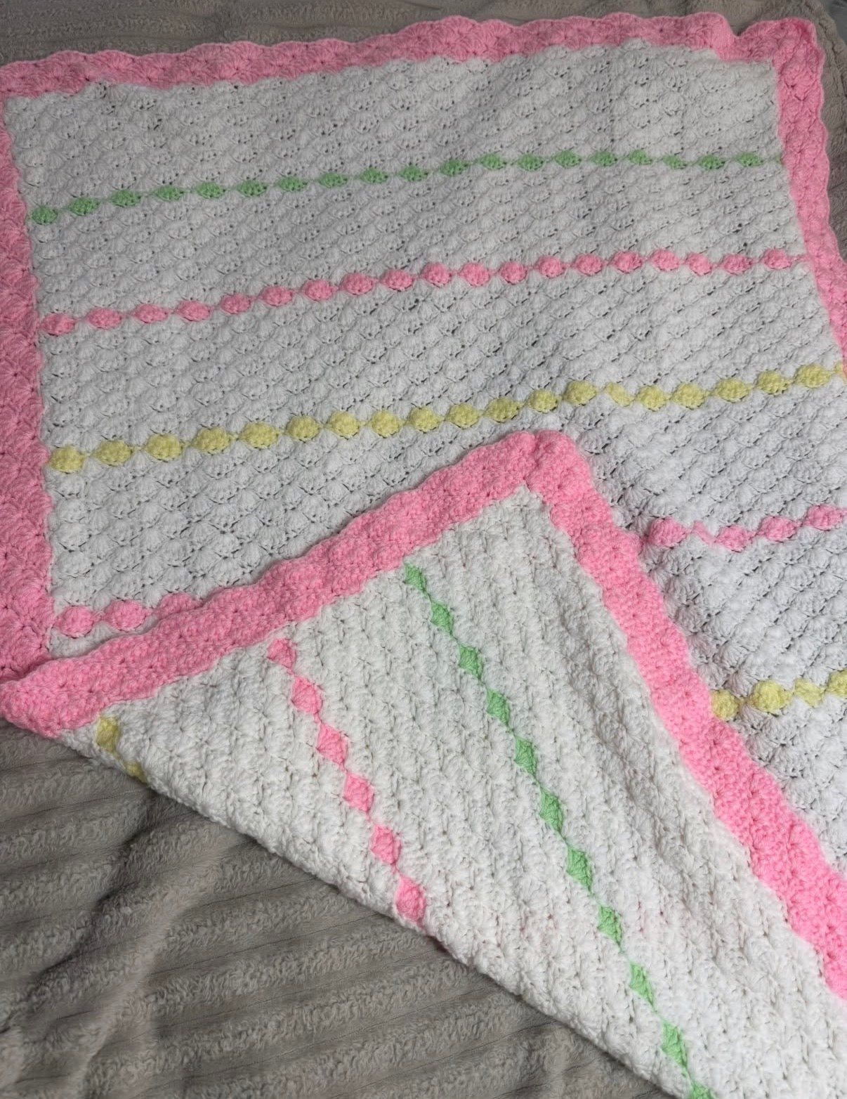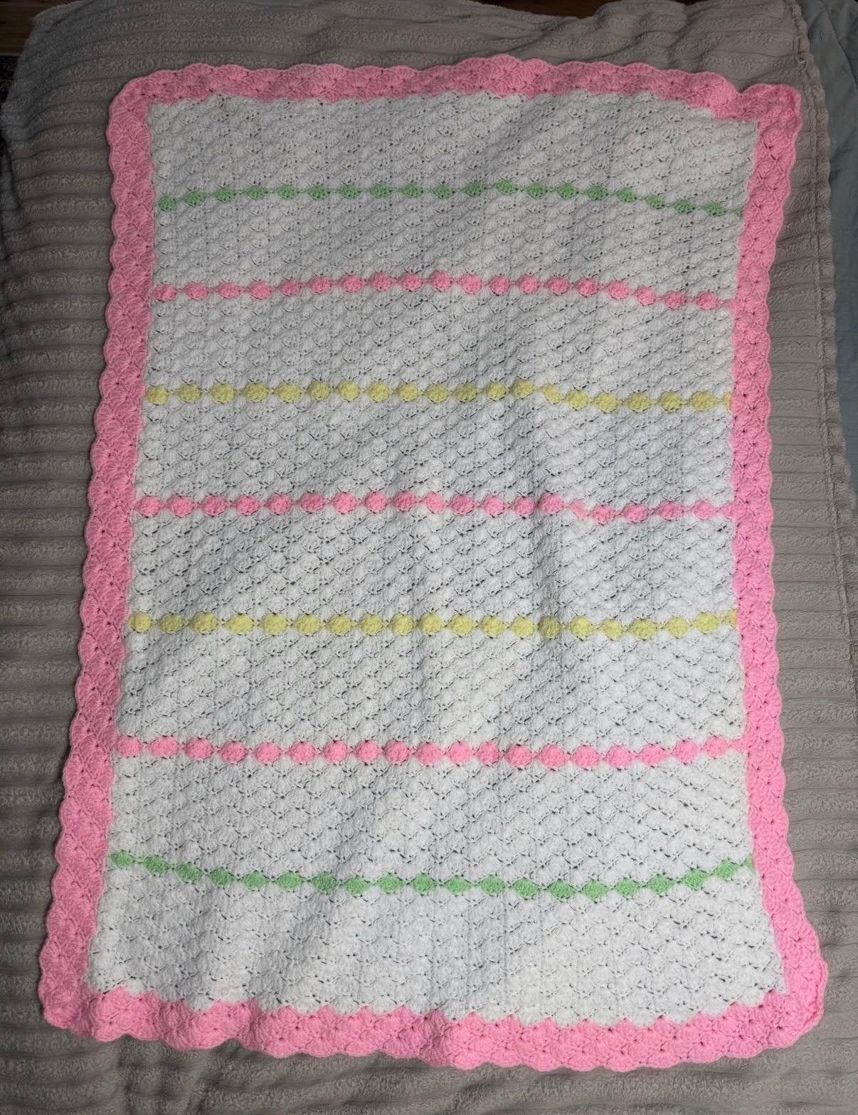 Sweet handmade crochet baby blanket with soft pastel stripes and a pink scalloped border. Cozy texture throughout with that classic vintage baby blanket feel 🤍 Perfect for a nursery, baby shower gift, or sweet keepsake.