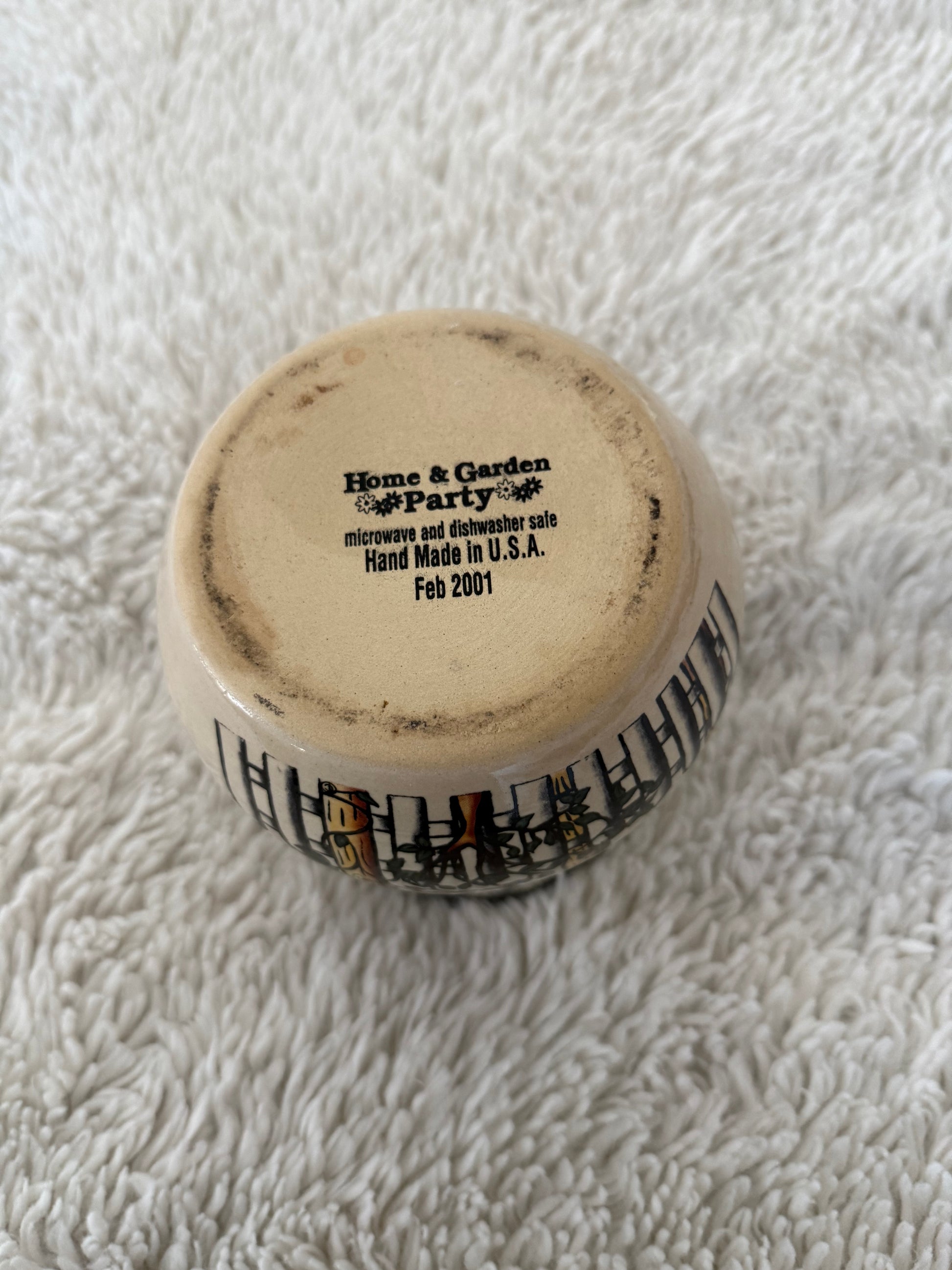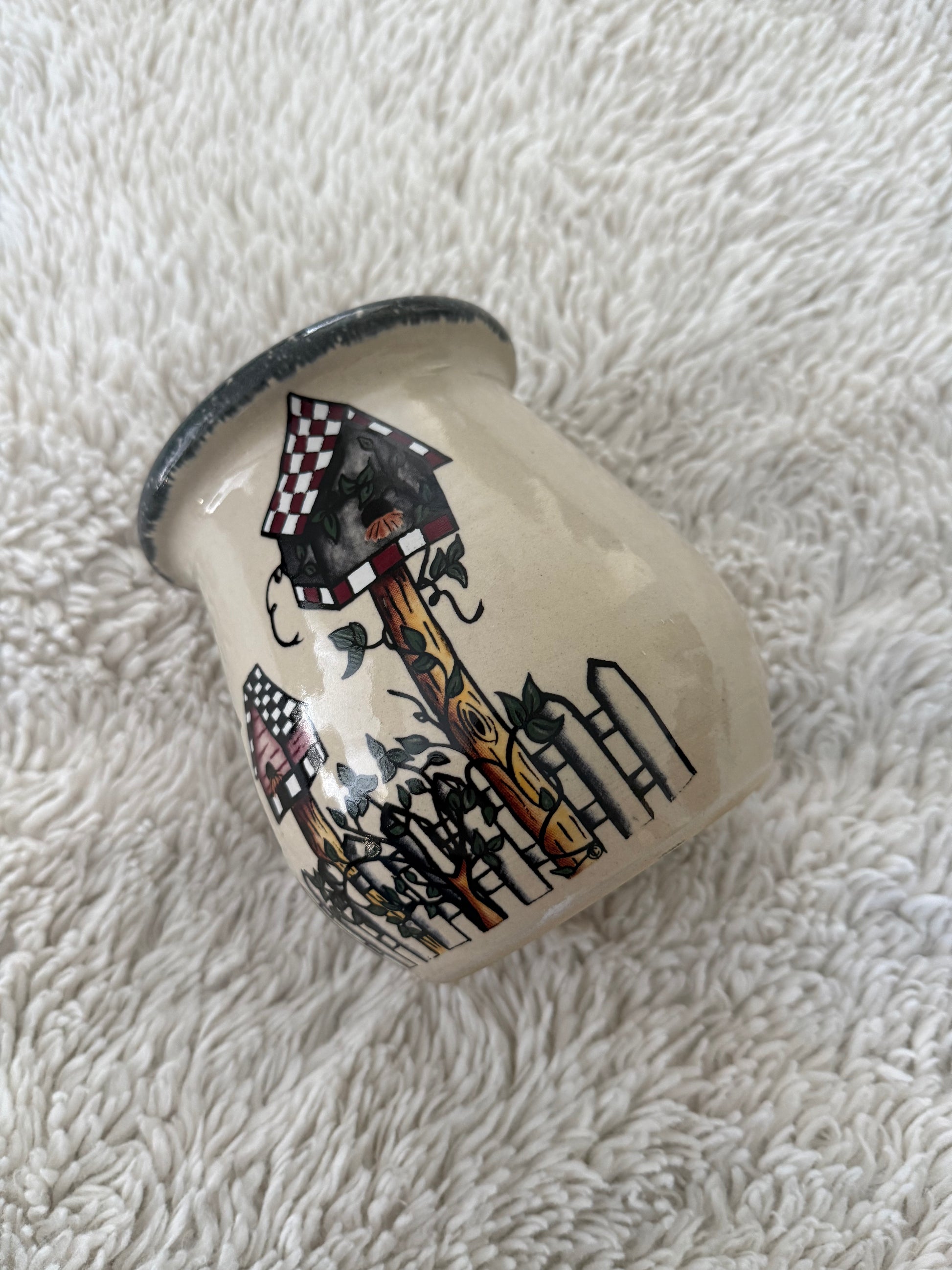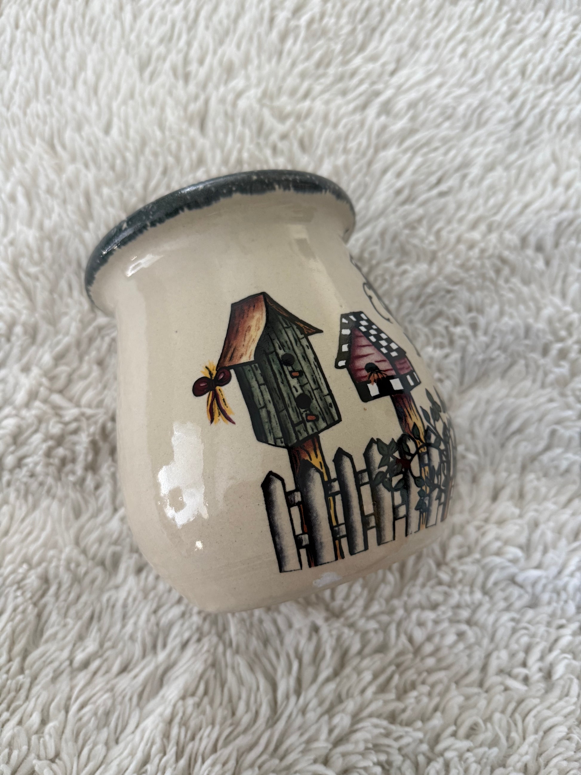 Charming stoneware crock featuring a cozy garden scene with birdhouses, fencing, and vines. Neutral cream glaze with a softly speckled rim — perfect for farmhouse kitchens, utensil storage, or shelf styling. Dated Feb 2001. Approx. 7" tall